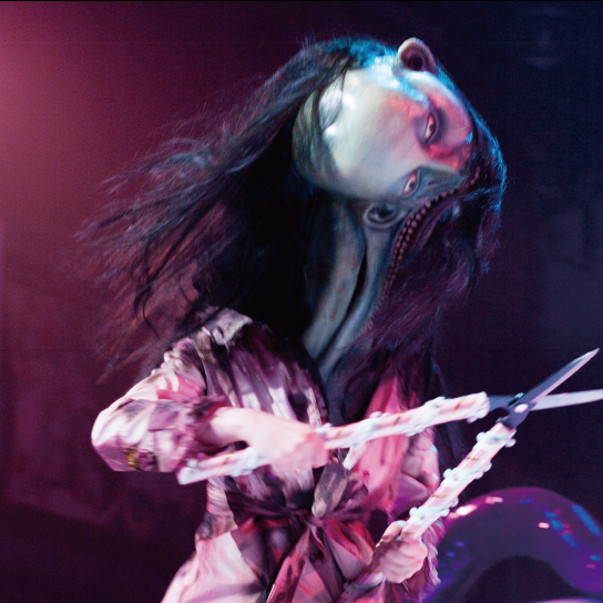 「祟りっ娘」定番の白ワンピで登場したのは、無造作に伸ばした黒髪ロングがお似合いの「口裂け娘」。深夜の公園で、人けの無い路上で、うつむき加減に佇む姿がとっても魅力的。胸元まで大きく裂けたその唇で、今夜はどんな男性に呪詛の言葉をつぶやくのかな?血の気の失せた青白い肌と、ワンピに染みた赤黒い血痕が好対照!
